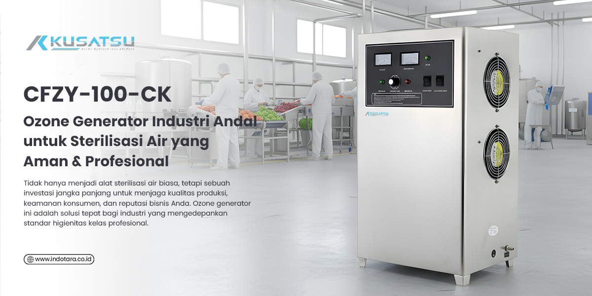 Dalam industri modern, khususnya sektor makanan, minuman, pengolahan buah dan sayur, serta water treatment, standar kebersihan tidak lagi cukup hanya dengan penyaringan biasa. Diperlukan sistem sterilisasi yang mampu membunuh bakteri, virus, jamur, dan mikroorganisme berbahaya secara menyeluruh tanpa meninggalkan residu kimia. Untuk menjawab kebutuhan tersebut, KUSATSU Industrial Ozone Generator model CFZY-100-CK hadir sebagai solusi sterilisasi air yang aman, efisien, dan ramah lingkungan untuk kebutuhan industri dan komersial.