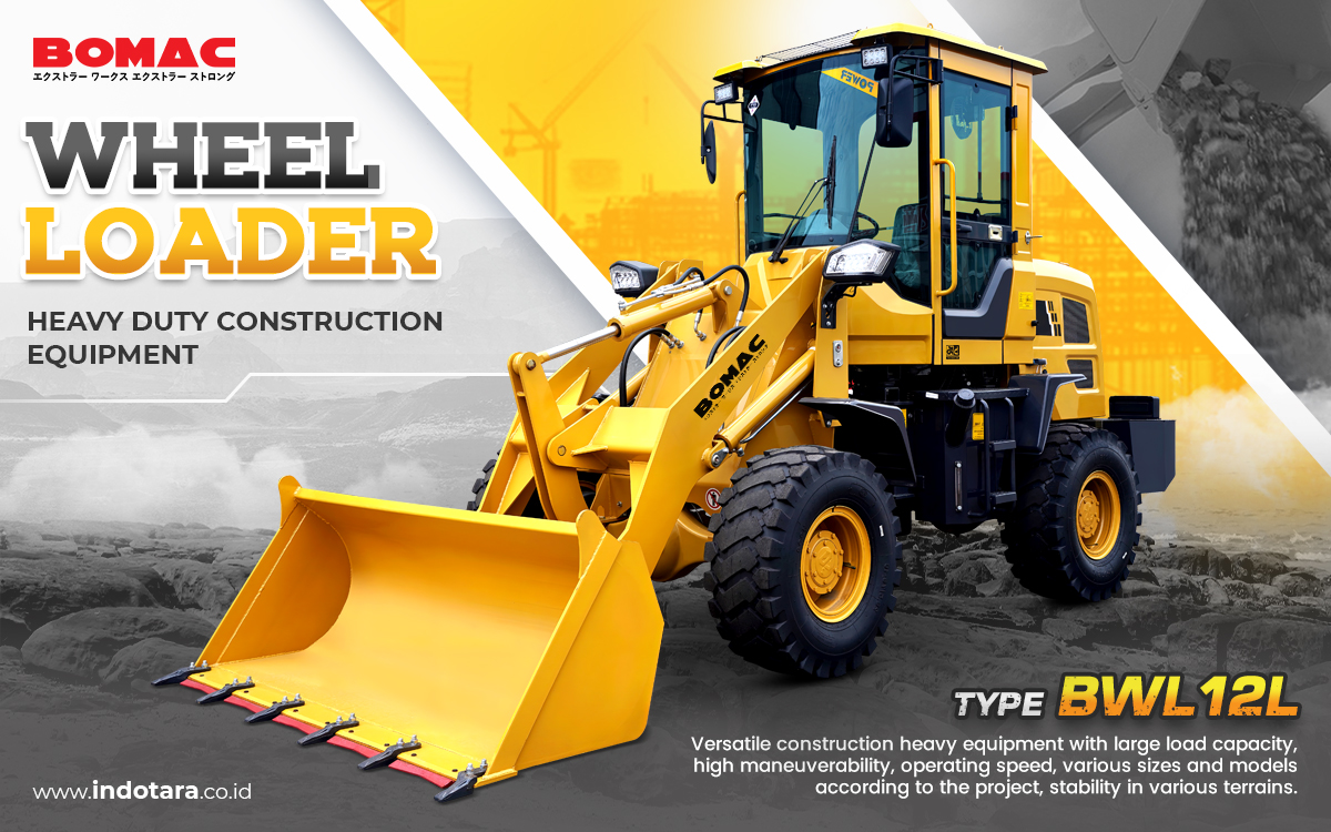 Jual Wheel Loader Berkualitas untuk Konstruksi - Bomac Wheel loaders are versatile construction machines for loading materials onto trucks or storage areas. Advantages include large load capacity, high maneuverability, operating speed, various sizes and models adapted to the project, stability in various terrains, long-distance transport capability, operator comfort with a spacious cabin, fuel efficiency, flexibility with additional equipment, and the latest technology. Wheel loaders play an important role in increasing productivity and efficiency in construction and land development.
