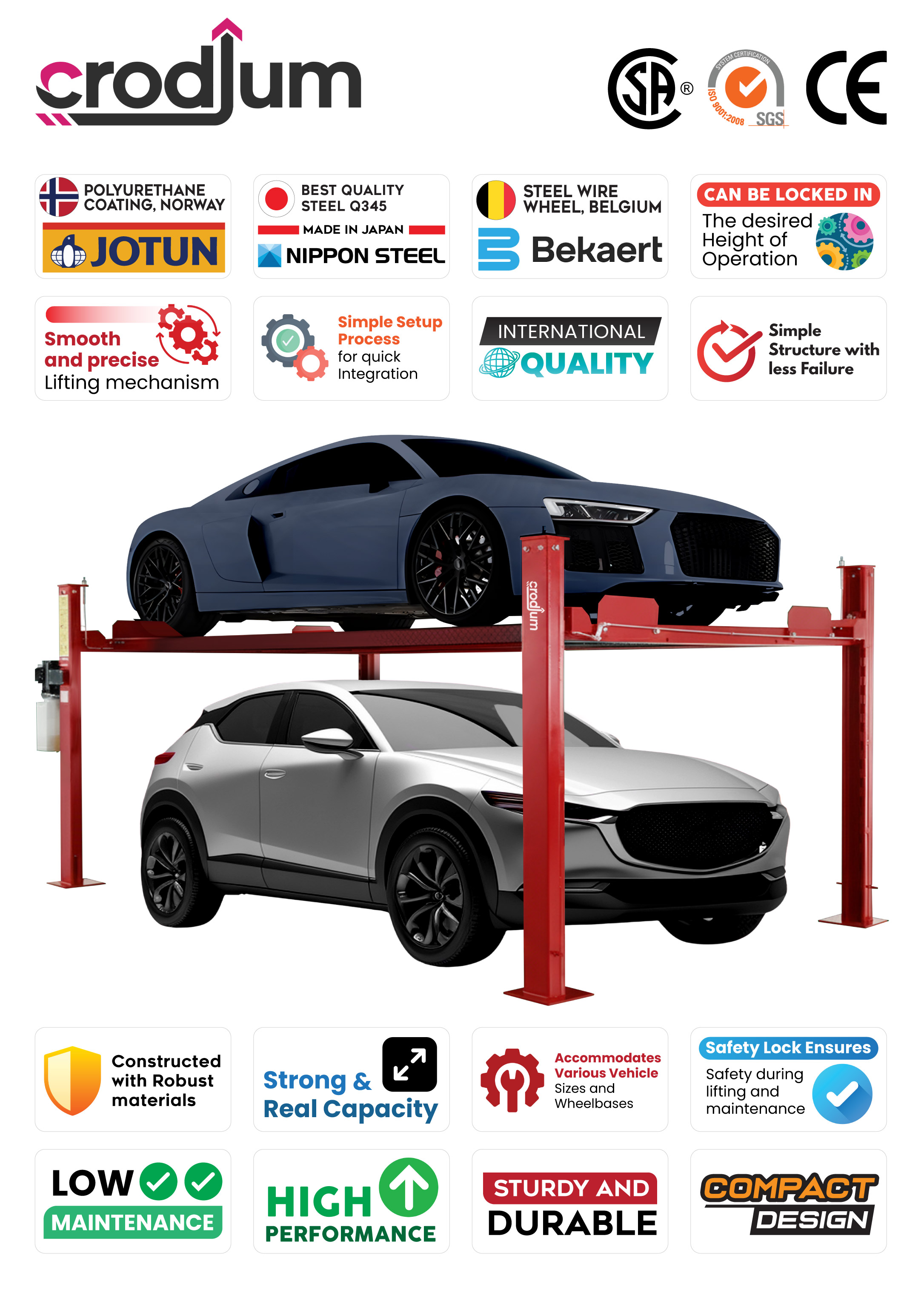 Jual CRODIUM Four Post Lift - Four-post lift is a robust automotive machine designed to elevate vehicles for maintenance, repair, and storage purposes. Consisting of four sturdy columns, this lift provides stable support for cars, and trucks. With hydraulic or electric mechanisms, it effortlessly raises vehicles off the ground, allowing easy access to the undercarriage for tasks like oil changes, brake repairs, and tire rotations.