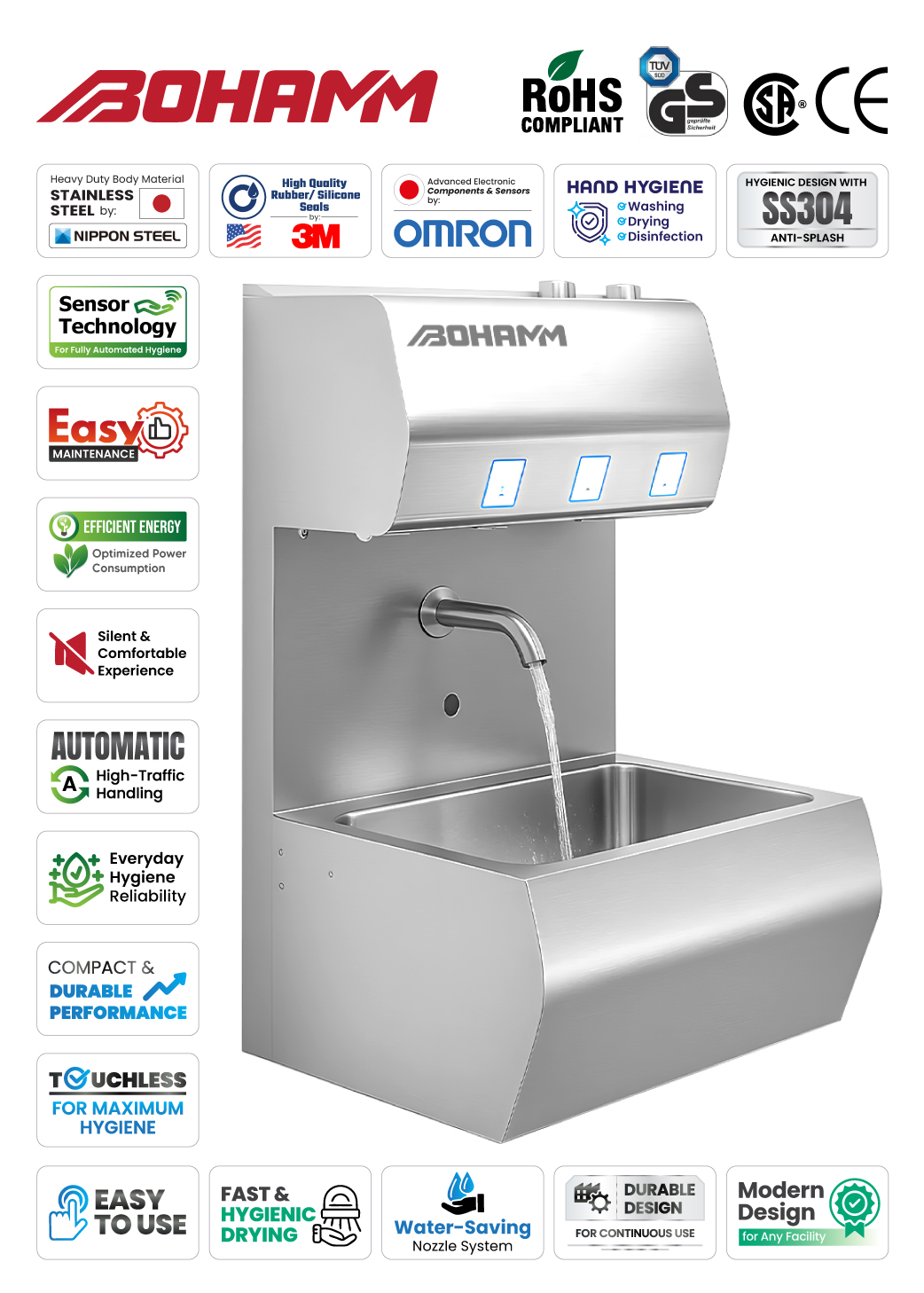 BOHAMM - Heavy Duty Hands Wash Dryer - is designed for high-demand industrial environments. Equipped with an automatic hand washing and drying system made of high-quality stainless steel, it ensures optimal hygiene with exceptional durability. Ideal for food processing areas, manufacturing facilities, and healthcare environments that require the highest hygiene standards.