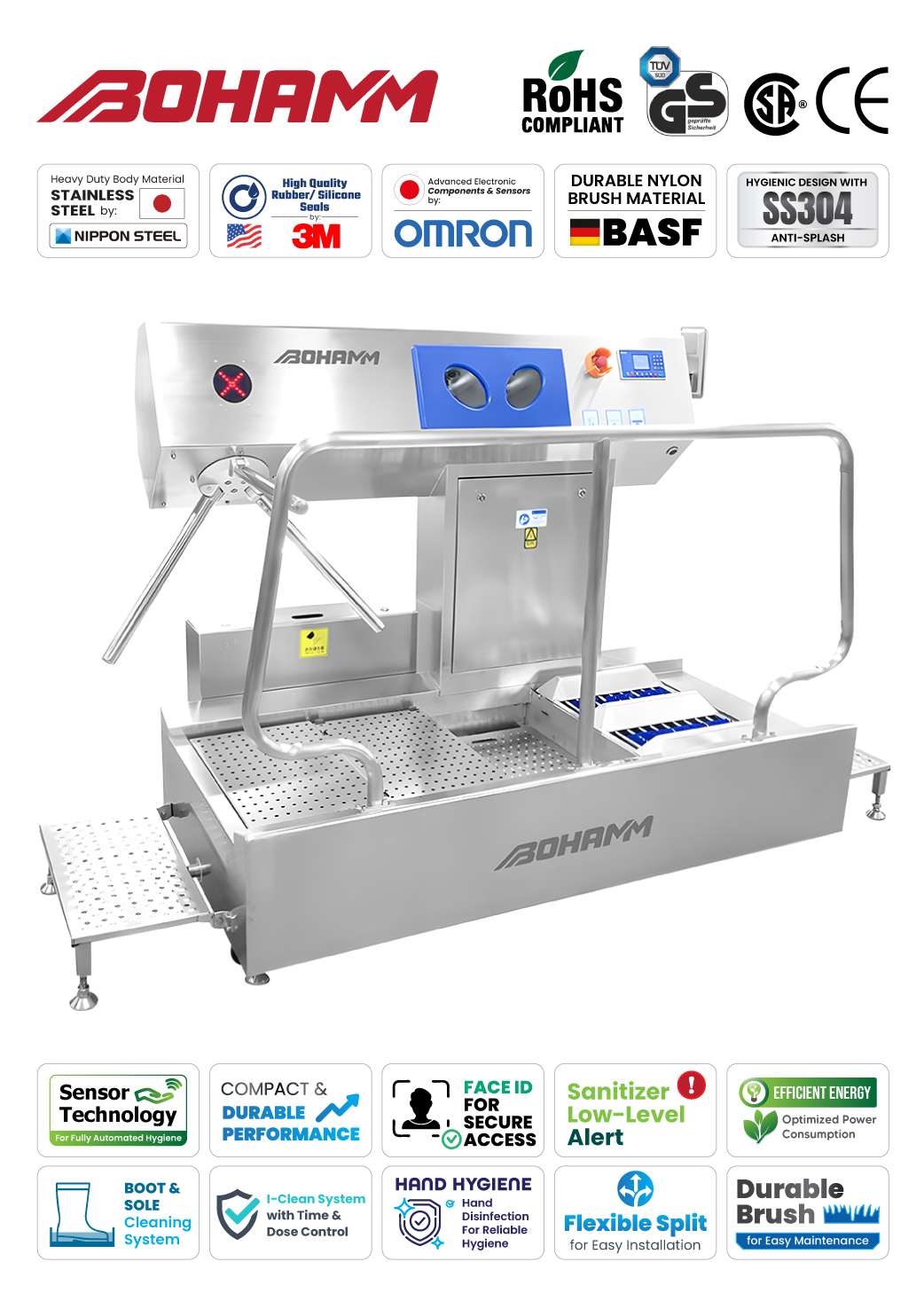 BOHAMM - Heavy Duty Industrial Personal Hygiene Station - is designed for high-demand industrial environments. Equipped with an automatic hand washing and drying system made of high-quality stainless steel, it ensures optimal hygiene with exceptional durability. Ideal for food processing areas, manufacturing facilities, and healthcare environments that require the highest hygiene standards.